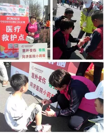 赛程中,突然一名参与亲子马拉松的小选手在母亲的陪同下向医大志愿者走来:“医生,我膝盖磕破了……”,“别担心,小朋友,只是表皮擦伤......”医大志愿者见状,迅速打开急救箱,碘伏、纱布、绷带,不到一分钟后,经过伤口灭菌处理后的小家伙坚强的重返赛场。